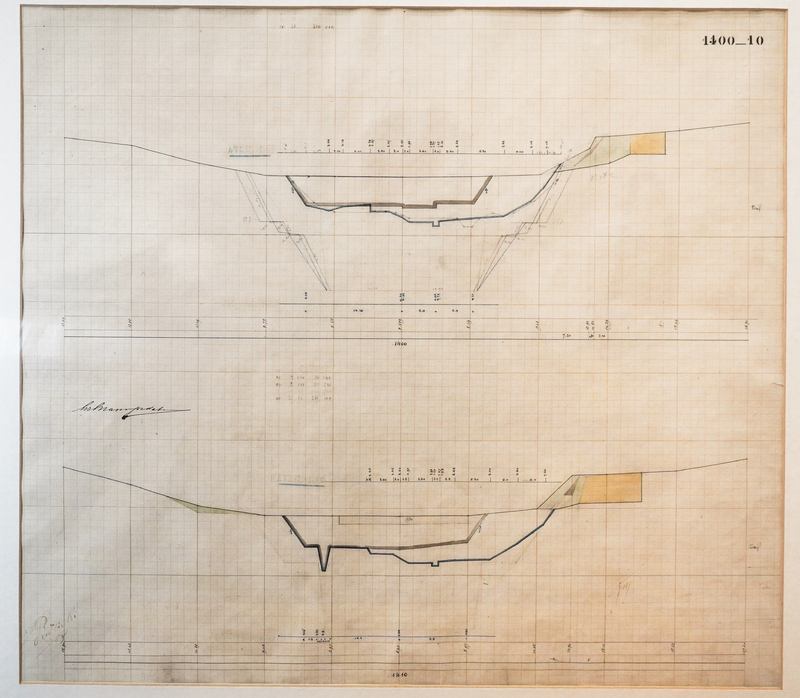 - Έγχρωμο σχέδιο προόδου εκσκαφικών εργασιών (μηκοτομή) χιλ. σημείων 1400-10 με μελάνι και έγχρωμο μολύβι σε χαρτί μιλιμετρέ.