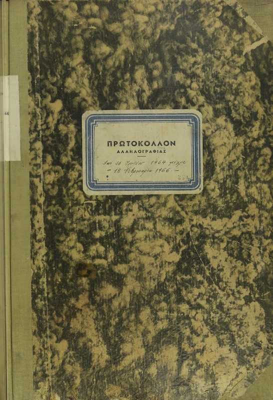 - Πρωτόκολλο αλληλογραφίας στο οποίο καταγράφονται εισερχόμενα και εξερχόμενα έγγραφα κατά την περίοδο 16 Ιουλίου 1964 - 18 Φεβρουαρίου 1966.