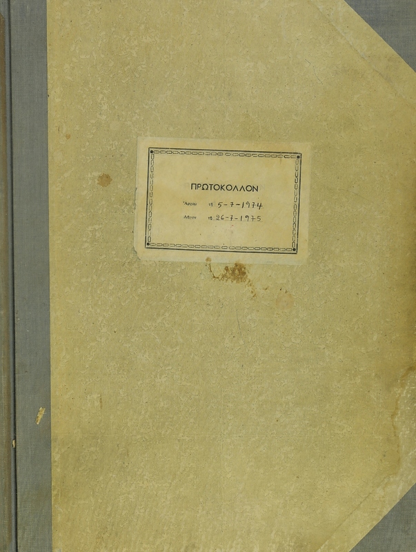 - Πρωτόκολλο αλληλογραφίας στο οποίο καταγράφονται εισερχόμενα και εξερχόμενα έγγραφα κατά την περίοδο 5 Ιουλίου 1974 - 26 Ιουλίου 1975.