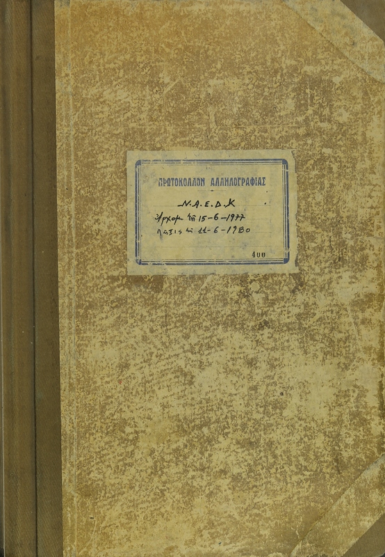 - Πρωτόκολλο αλληλογραφίας της Νέας Ανωνύμου Εταιρείας της Διώρυγος Κορίνθου στο οποίο καταγράφονται εισερχόμενα και εξερχόμενα έγγραφα κατά την περίοδο 15 Ιουνίου 1977 - 11 Ιουνίου 1980.