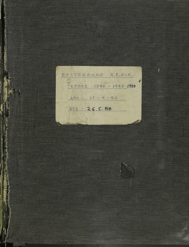 - Πρωτόκολλο της Ανωνύμου Εταιρείας Διώρυγος Κορίνθου στο οποίο καταγράφονται εισερχόμενα και εξερχόμενα έγγραφα κατά την περίοδο 11 Απριλίου 1986 - 26 Μαΐου 1988.