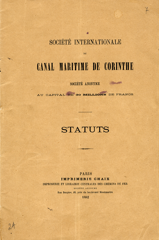 - Εξώφυλλο καταστατικού στη γαλλική της εταιρείας με επωνυμία "Societe Internationale du Canal Maritime de Corinthe".