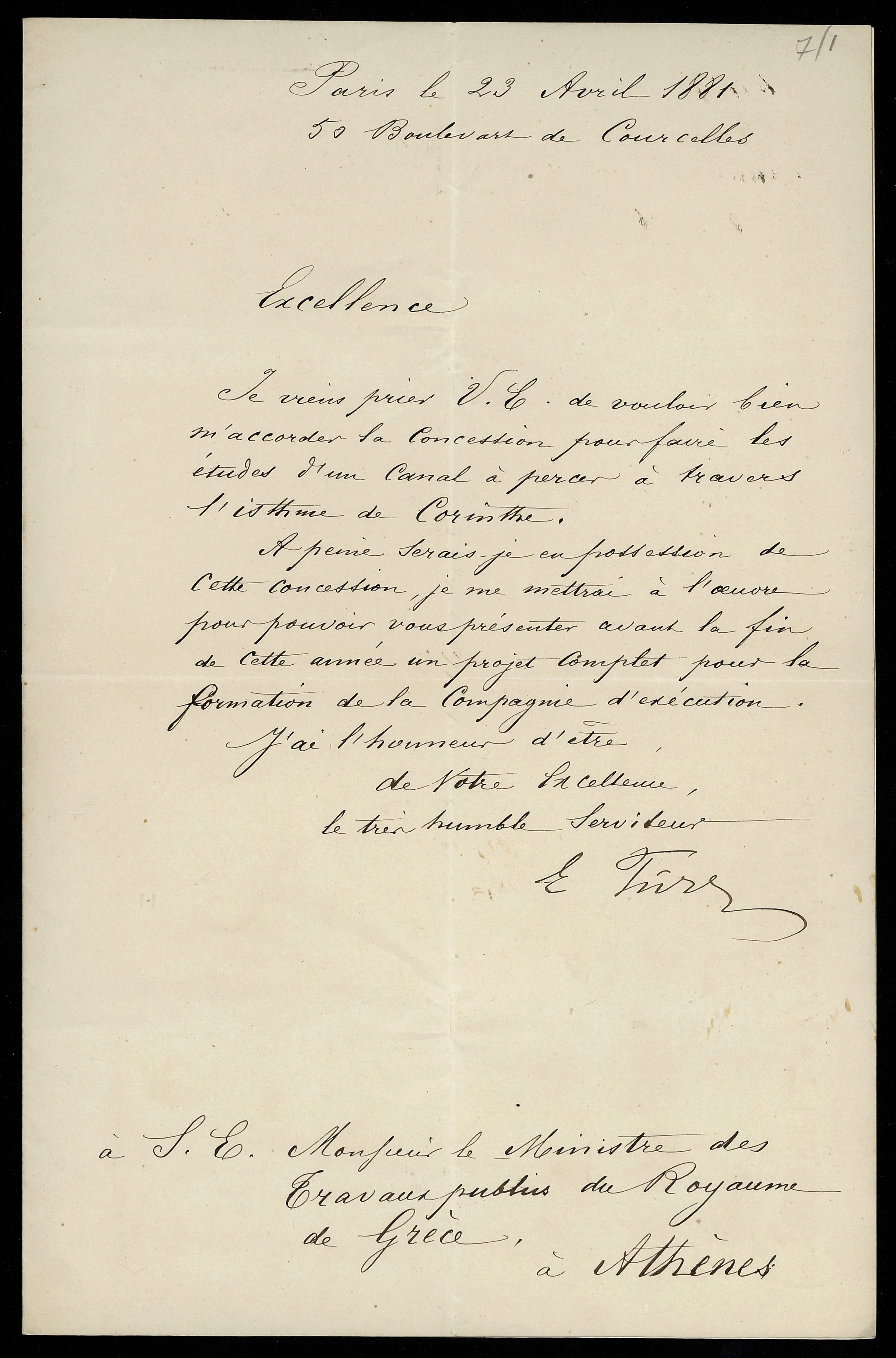 Επιστολή Etienne Turr [ή Istvan Turr ή Stefano Turr] προς τον Υπουργό Δημοσίων Έργων