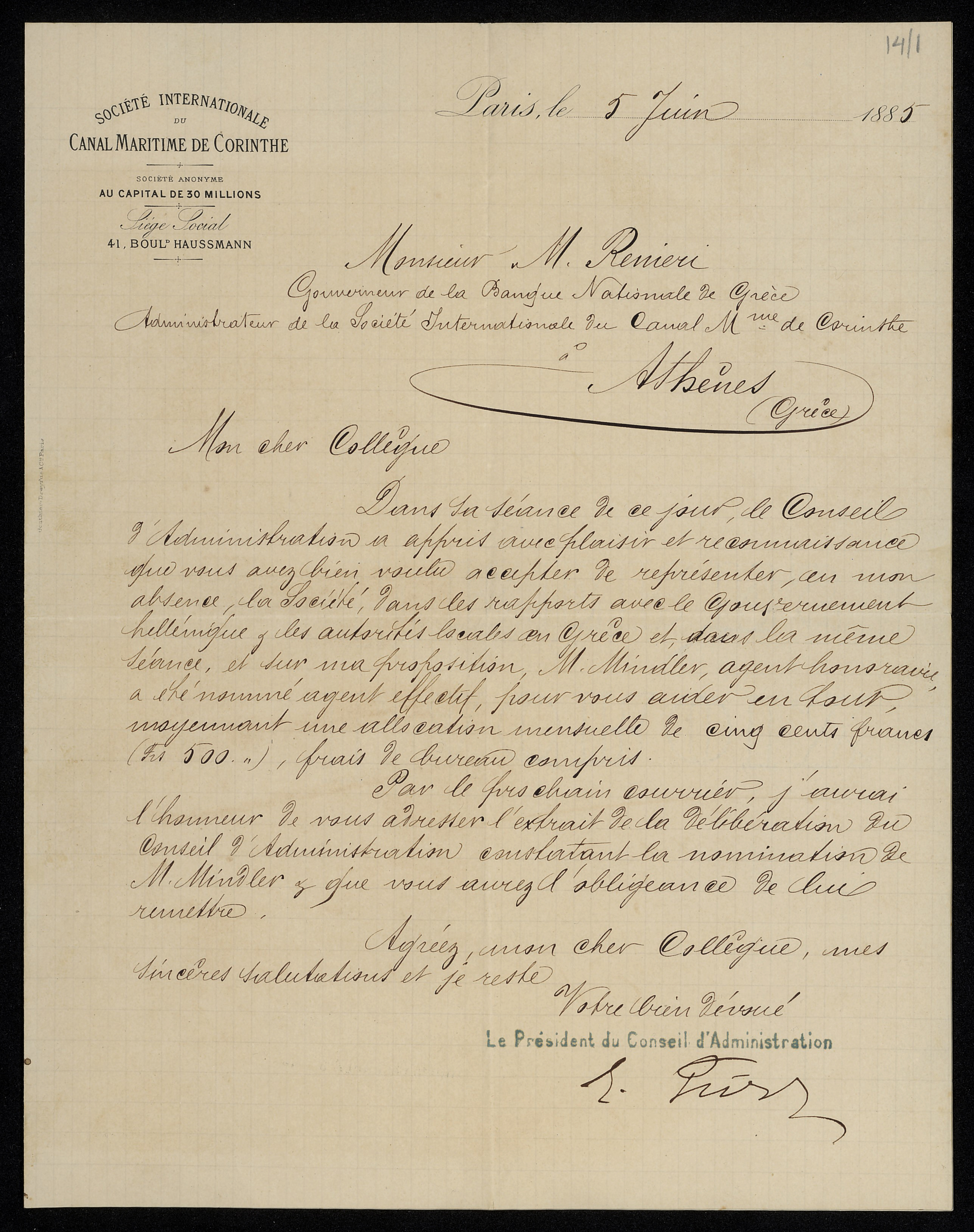 Επιστολή του Τυρρ, προέδρου του Διοικητικού Συμβουλίου της Διεθνούς Εταιρείας της Θαλασσίας Διώρυγος της Κορίνθου προς τον διοικητή της Εθνικής Τράπεζας και συμβούλου της εταιρείας Μάρκο Ρενιέρη, ο οποίος κατά την απουσία του προέδρου ανέλαβε την εκπροσώπησή της απέναντι στην ελληνική κυβέρνηση και τις τοπικές αρχές.
