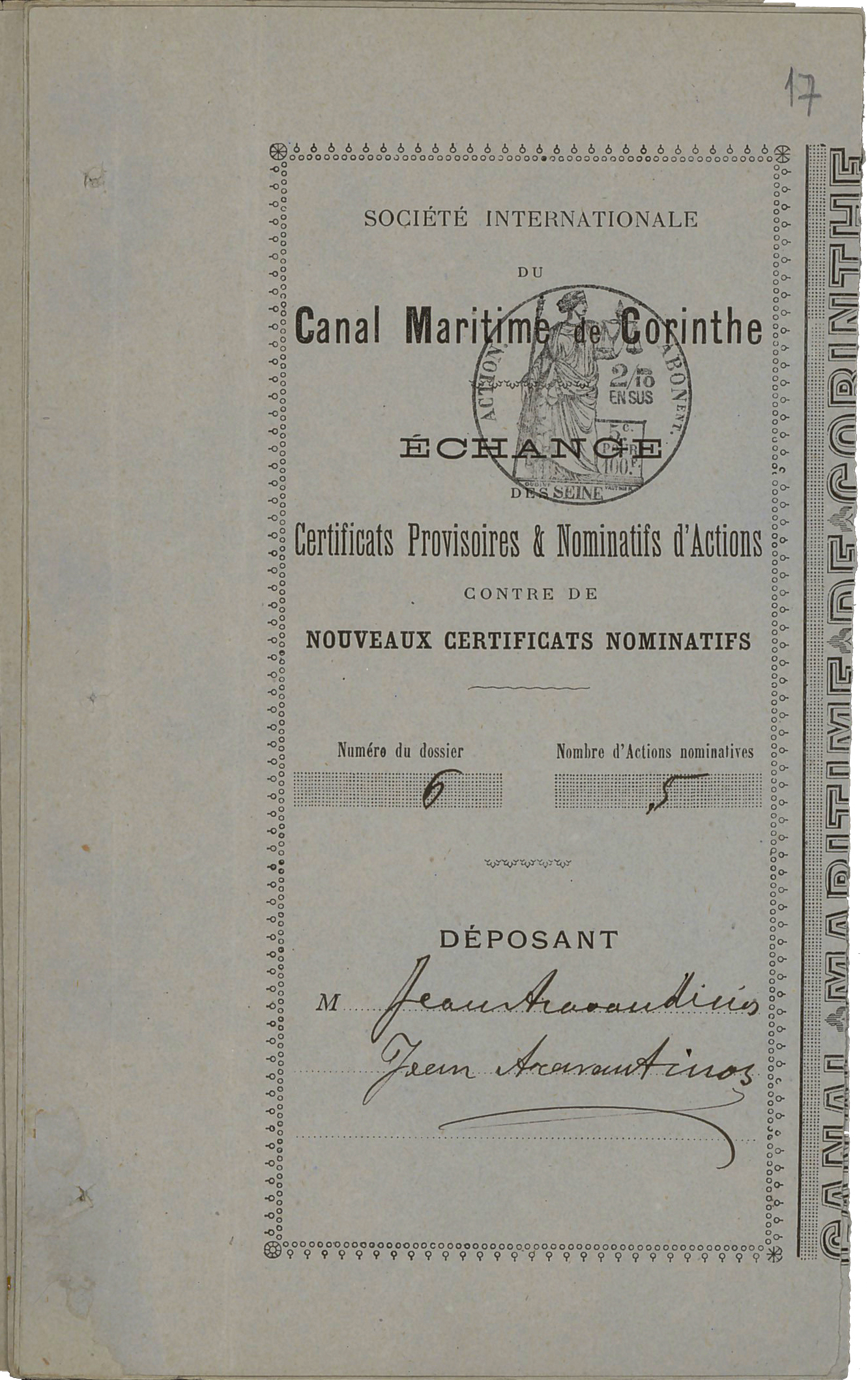 - Στέλεχος προσωρινής μετοχής της Διεθνούς Εταιρείας της Θαλασσίας Διώρυγος της Κορίνθου στο όνομα κ. Ιωάννη Αραβαντινού.