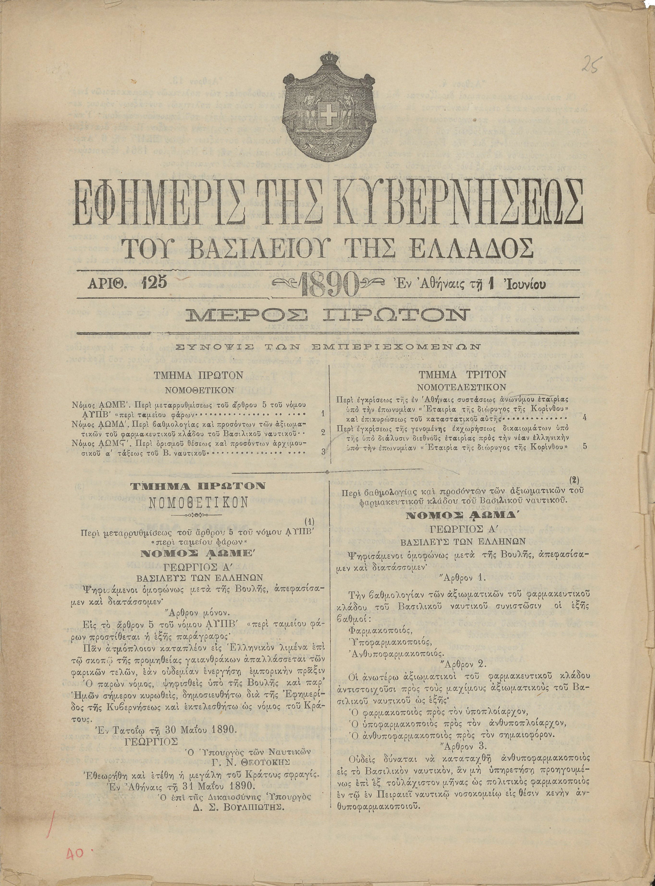 Φύλλο Εφημερίδος της Κυβερνήσεως, αριθ. 125 της 1ης Ιουνίου 1890, όπου δημοσιεύθηκαν: Η έγκριση της σύστασης της Εταιρείας της Διώρυγος της Κορίνθου και η επικύρωση του καταστατικού της. Η έγκριση της εκχώρησης των δικαιωμάτων από την προηγούμενη γαλλική στη νέα ελληνική εταιρεία.