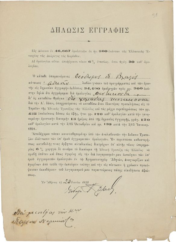 - Δήλωση εγγραφής του Θεοδώρου Α. Βλαστού στο δάνειο του 1890 για πενήντα ομολογίες και απόδειξη κατάθεσης στο ταμείο της Εθνικής Τράπεζας 2.500 φράγκων για την πρώτη δόση.
