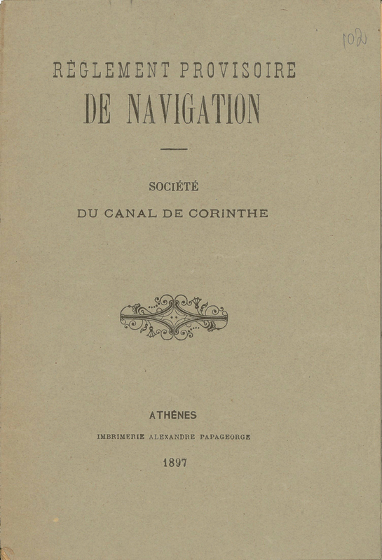 - Εξώφυλλο της γαλλικής έκδοσης της Εταιρείας της Διώρυγος της Κορίνθου με τους προσωρινούς κανόνες ναυσιπλοΐας το 1897.