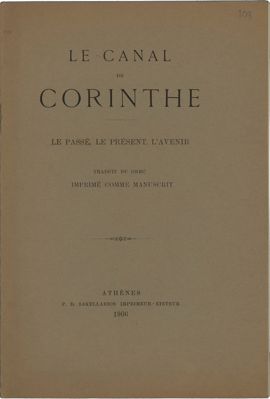 - Εξώφυλλο της έκδοσης στα γαλλικά από το ελληνικό χειρόγραφο μελετήματος για το παρελθόν, το παρόν και το μέλλον της διώρυγας της Κορίνθου.