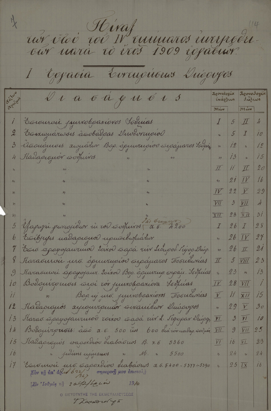 - Πίνακας των εργασιών που εκτέλεσε το 1909 το τμήμα συντήρησης της διώρυγας της Κορίνθου, υπογεγραμμένο στην πίσω όψη από τον υπεύθυνο μηχανικό στις 20 Φεβρουάριου 1910.