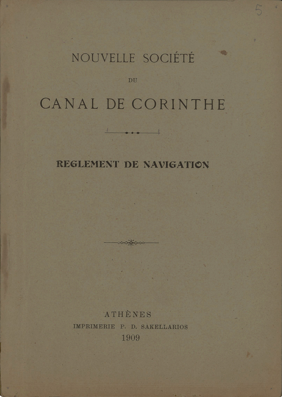 - Εξώφυλλο του κανονισμού ναυσιπλοΐας της Νέας Εταιρείας της Διώρυγος της Κορίνθου στη Γαλλική Γλώσσα.