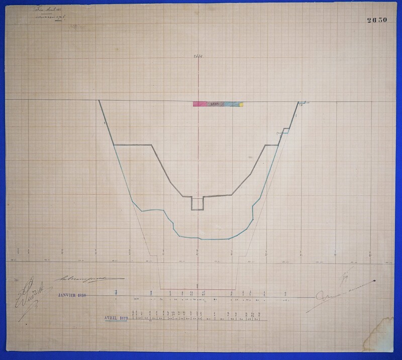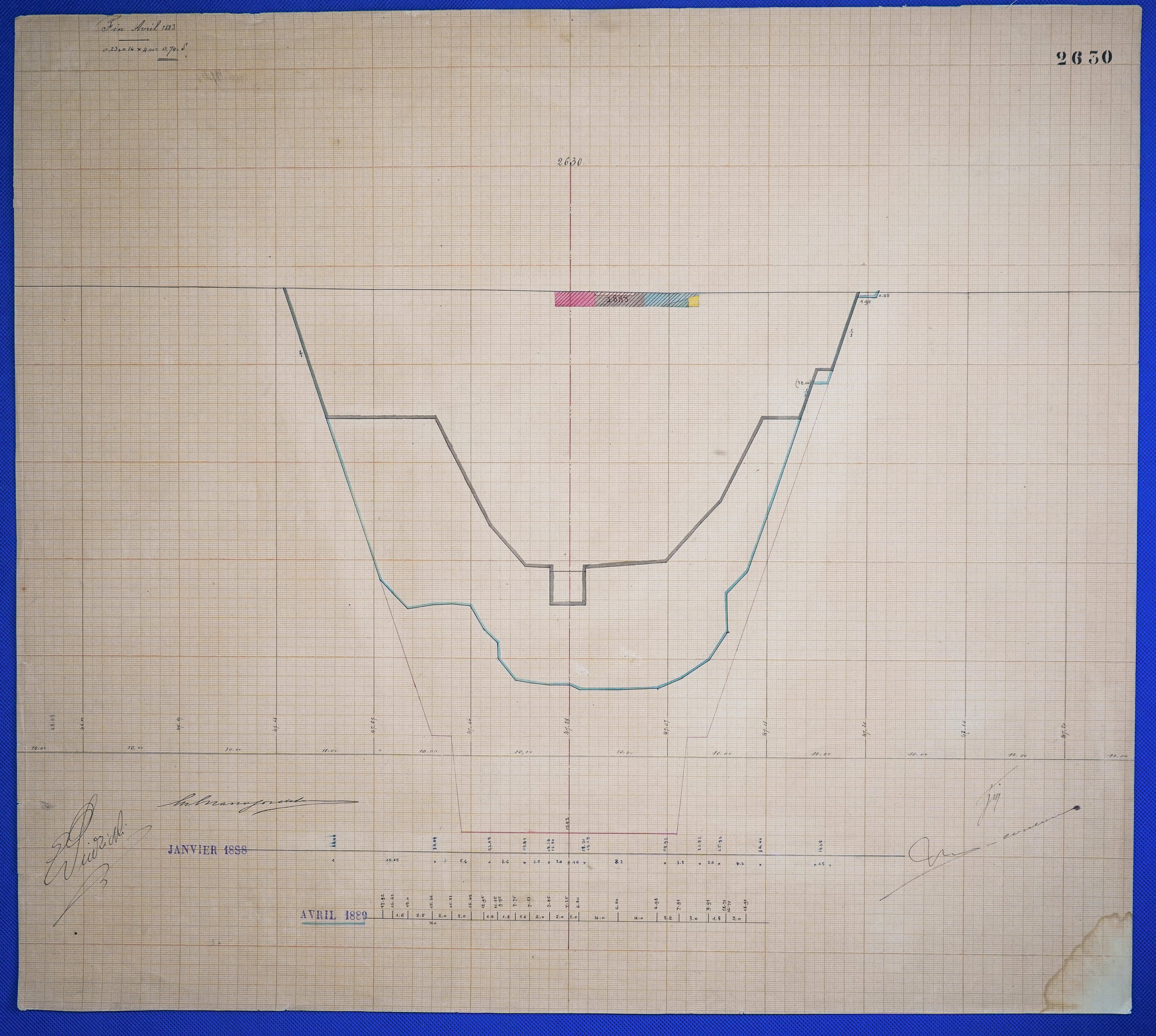 - Color drawing of excavation progress (Longitudinal Section) of kilometer point 2630 in ink and colored pencil on graph paper.