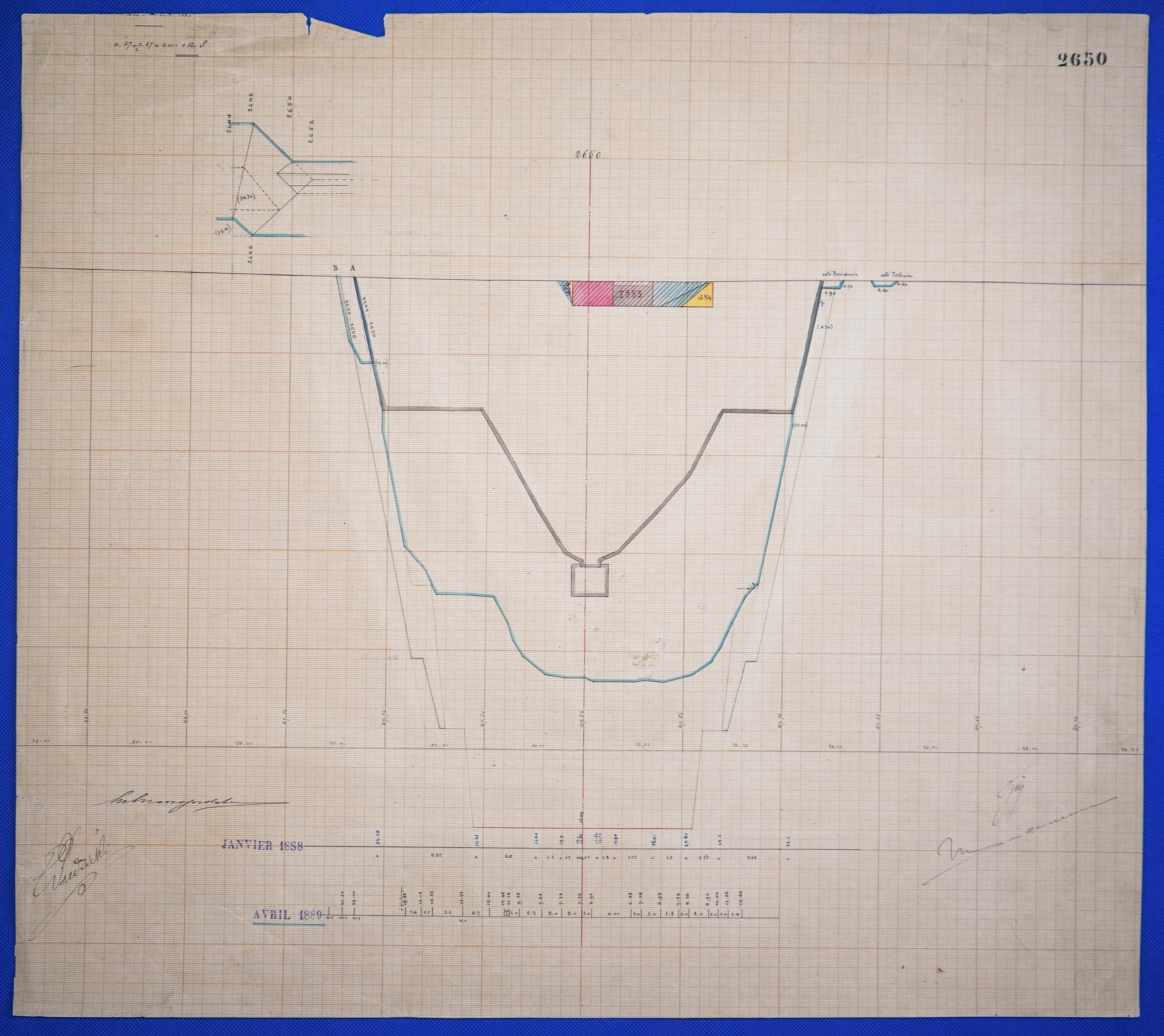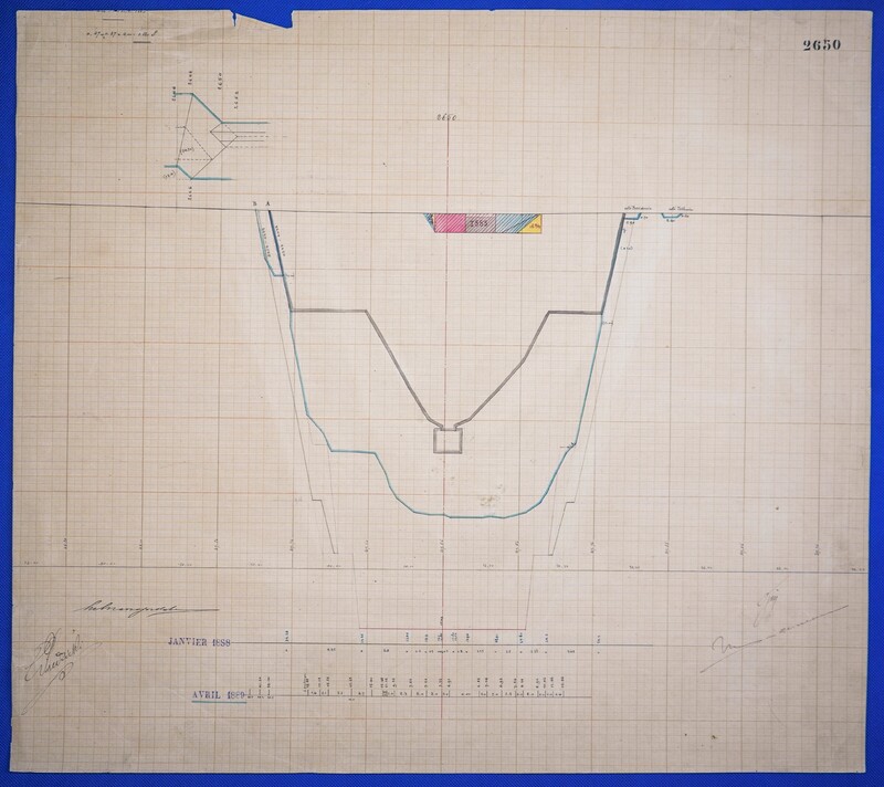 - Color drawing of excavation progress (Longitudinal Section) of kilometer point 2650 in ink and colored pencil on graph paper.