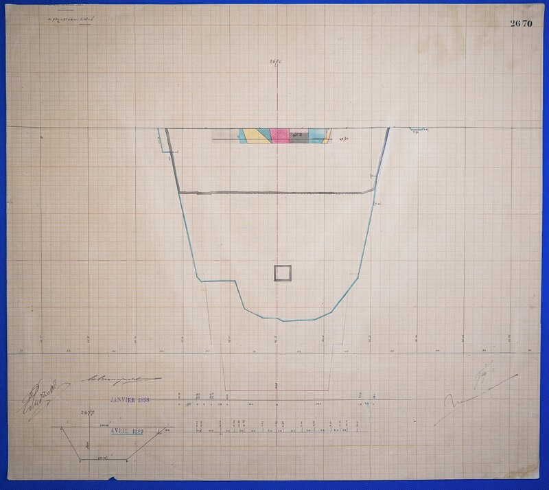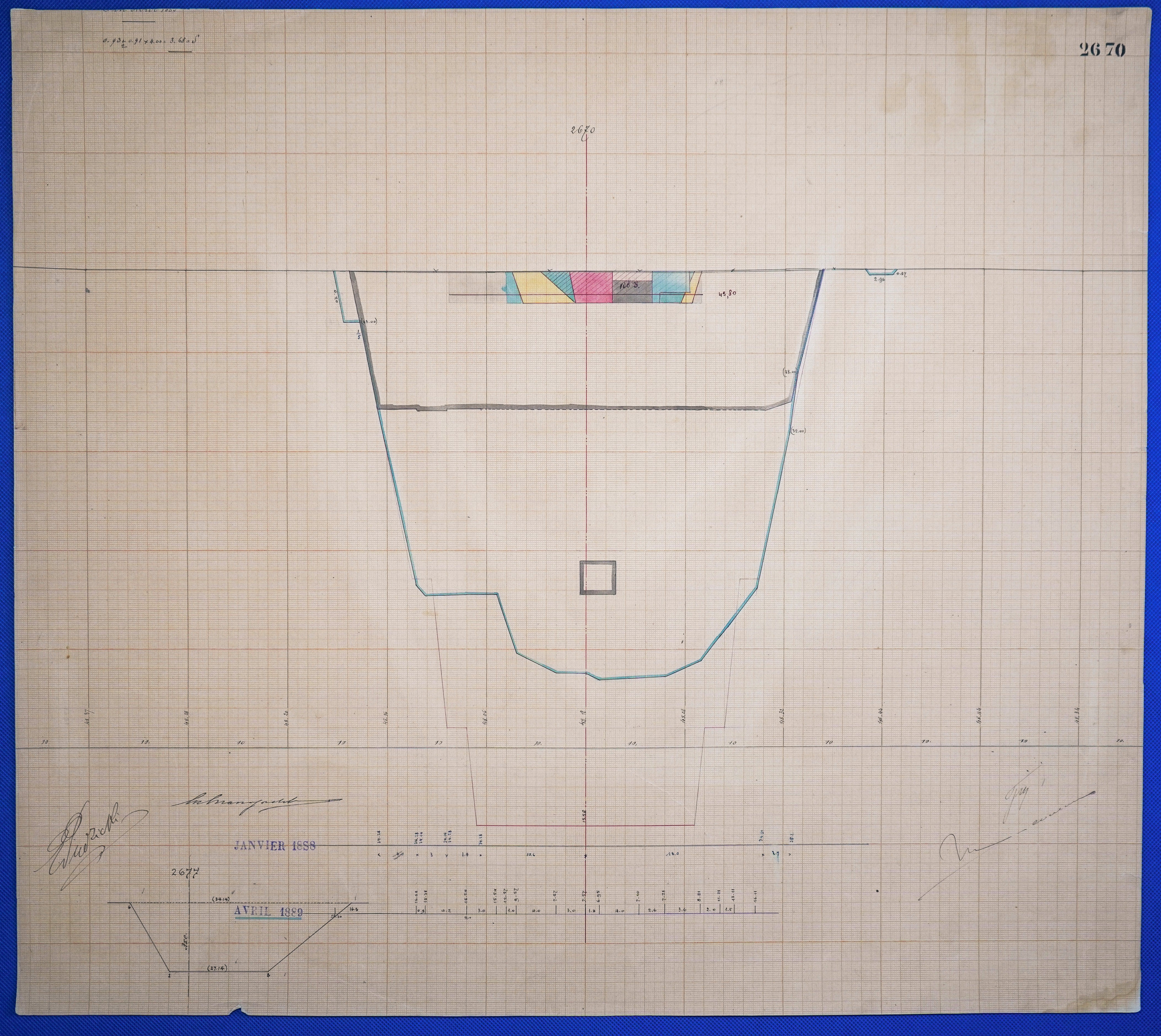 - Color drawing of excavation progress (Longitudinal Section) of kilometer point 2670 in ink and colored pencil on graph paper.