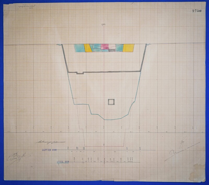 - Color drawing of excavation progress (Longitudinal Section) of kilometer point 2750 in ink and colored pencil on graph paper.