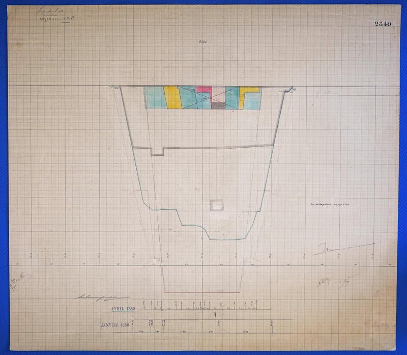 - Color drawing of excavation progress (Longitudinal Section) of kilometer point 2840 in ink and colored pencil on graph paper.