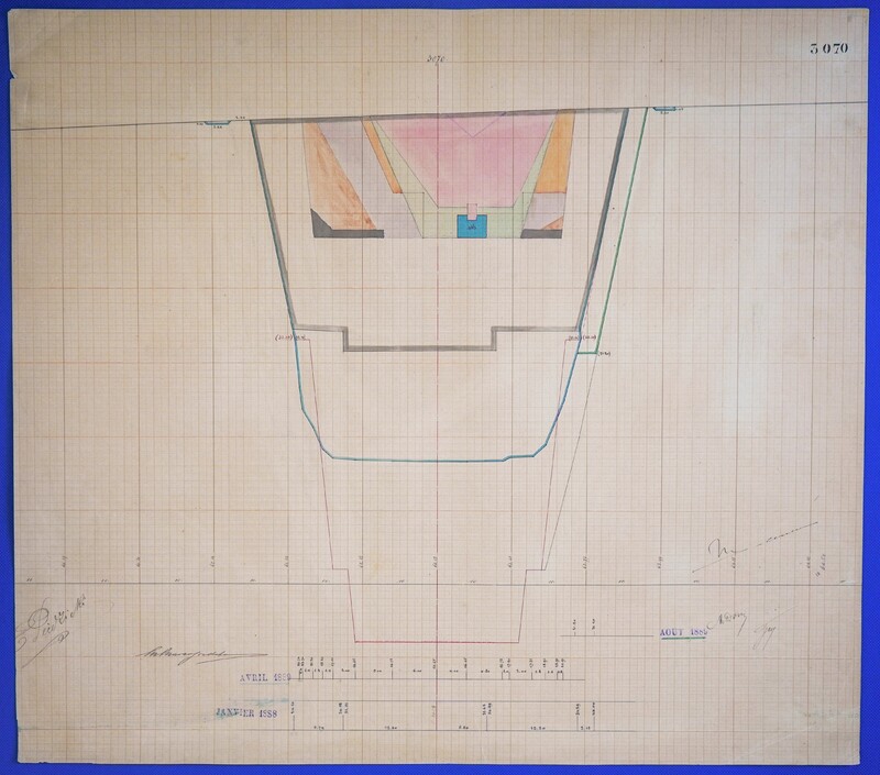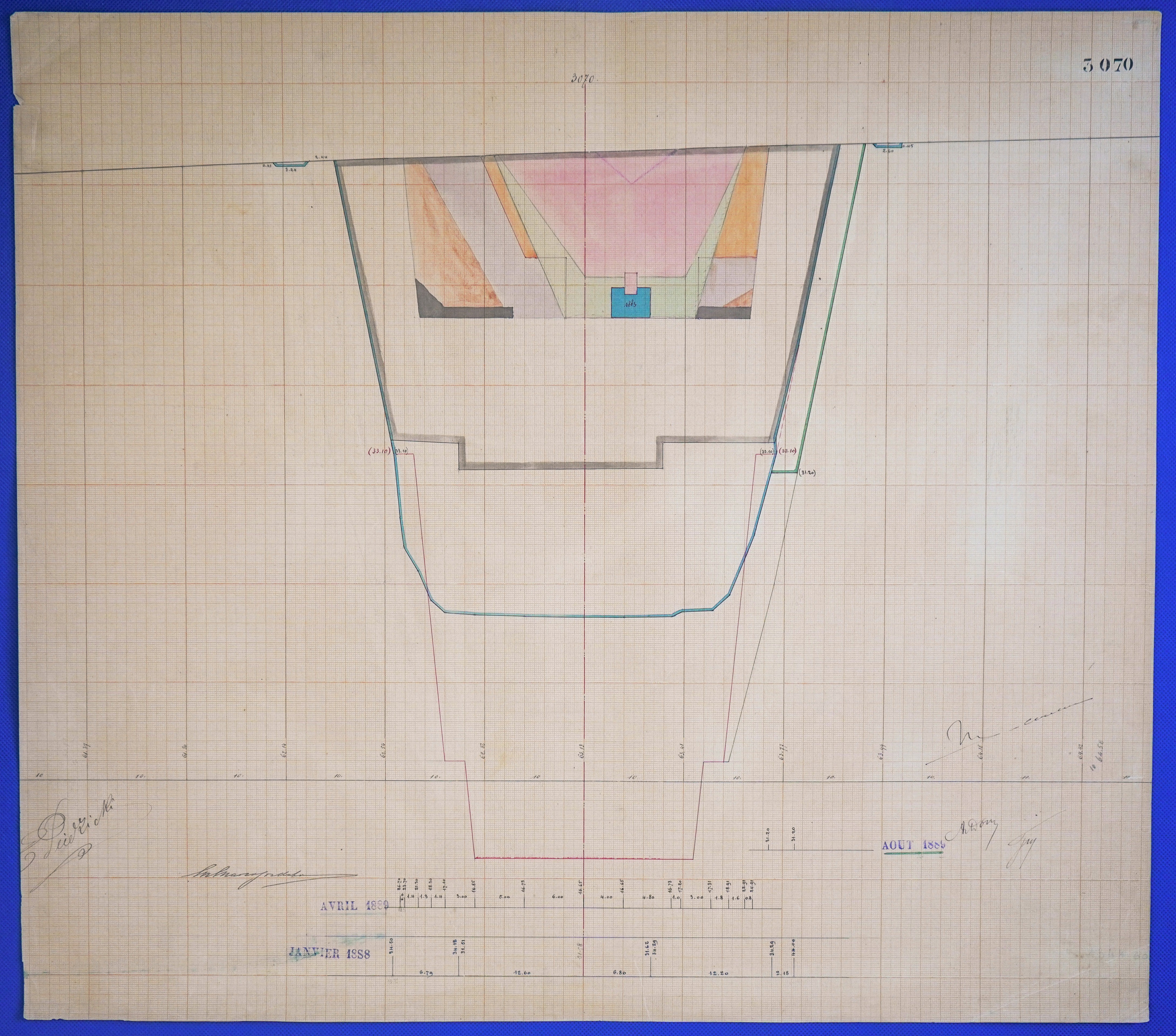 - Color drawing of excavation progress (Longitudinal Section) of kilometer point 3070 in ink and colored pencil on graph paper.