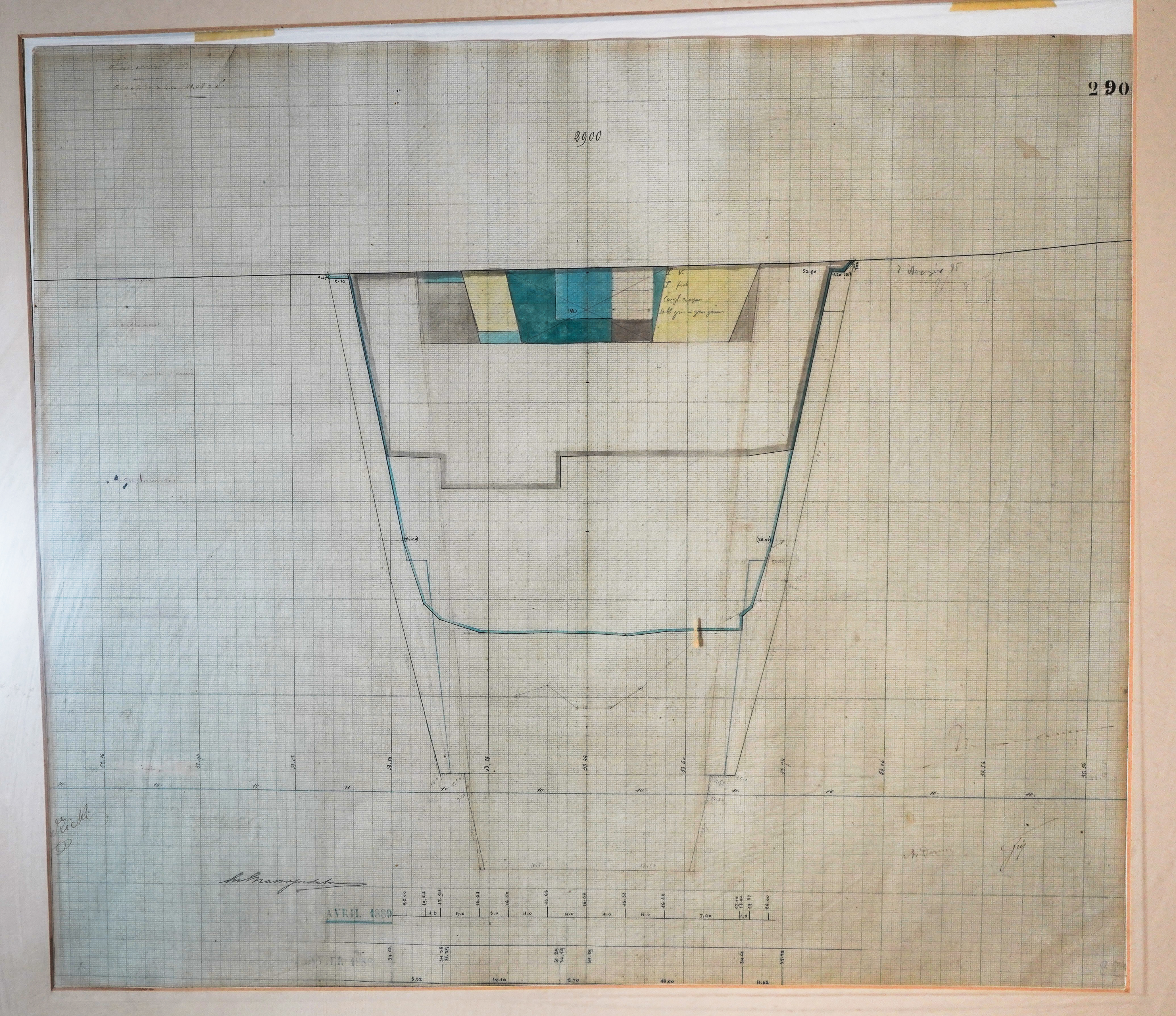 - Color drawing of excavation progress (Longitudinal Section) of kilometer point 2900 in ink and colored pencil on graph paper.