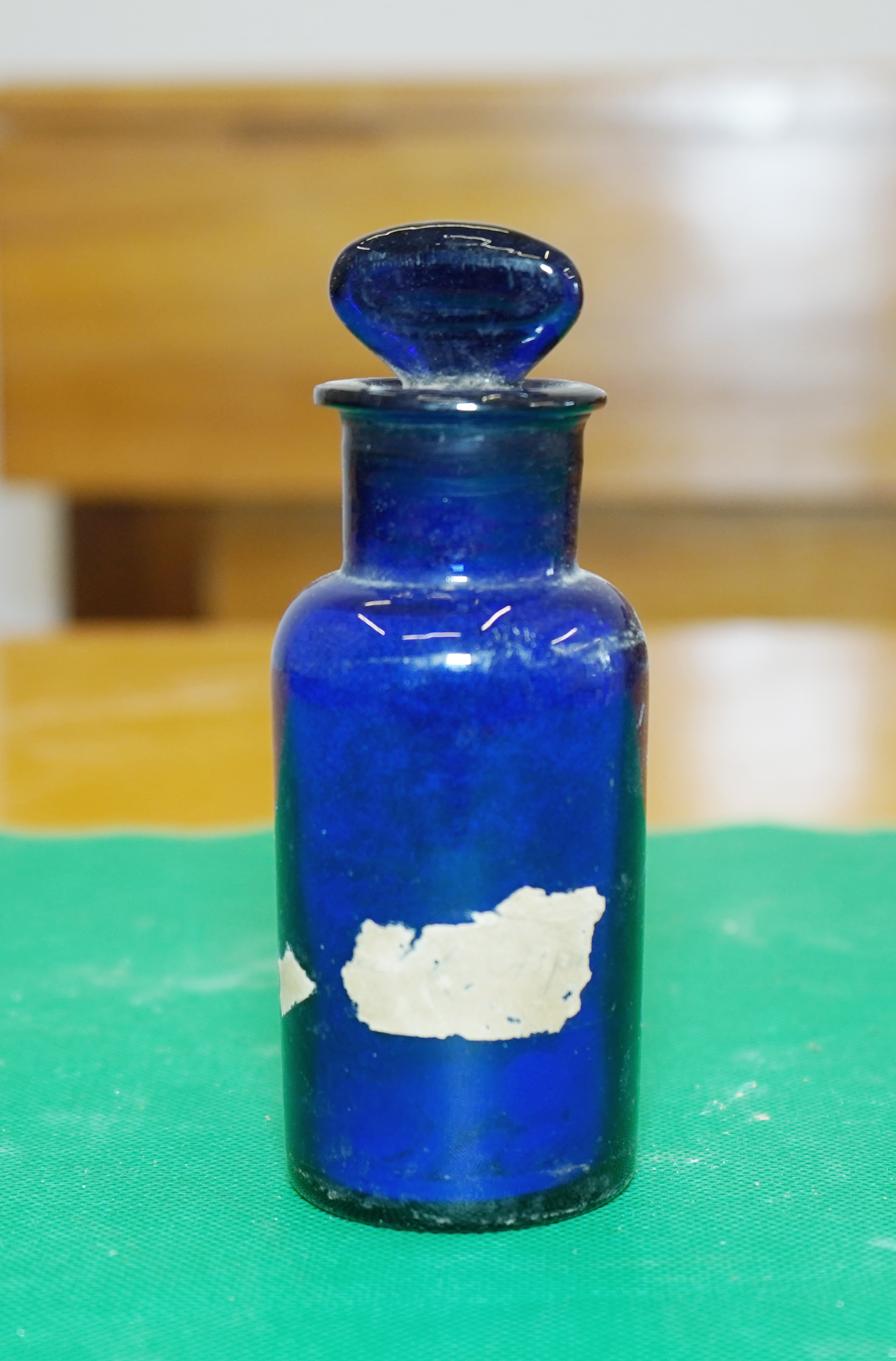 - Blue glass bottle with cap for medicines. A section of a paper label is preserved, with the text "AspL...". The stopper cannot be removed. Inside there are pills. It was probably used to store pills.